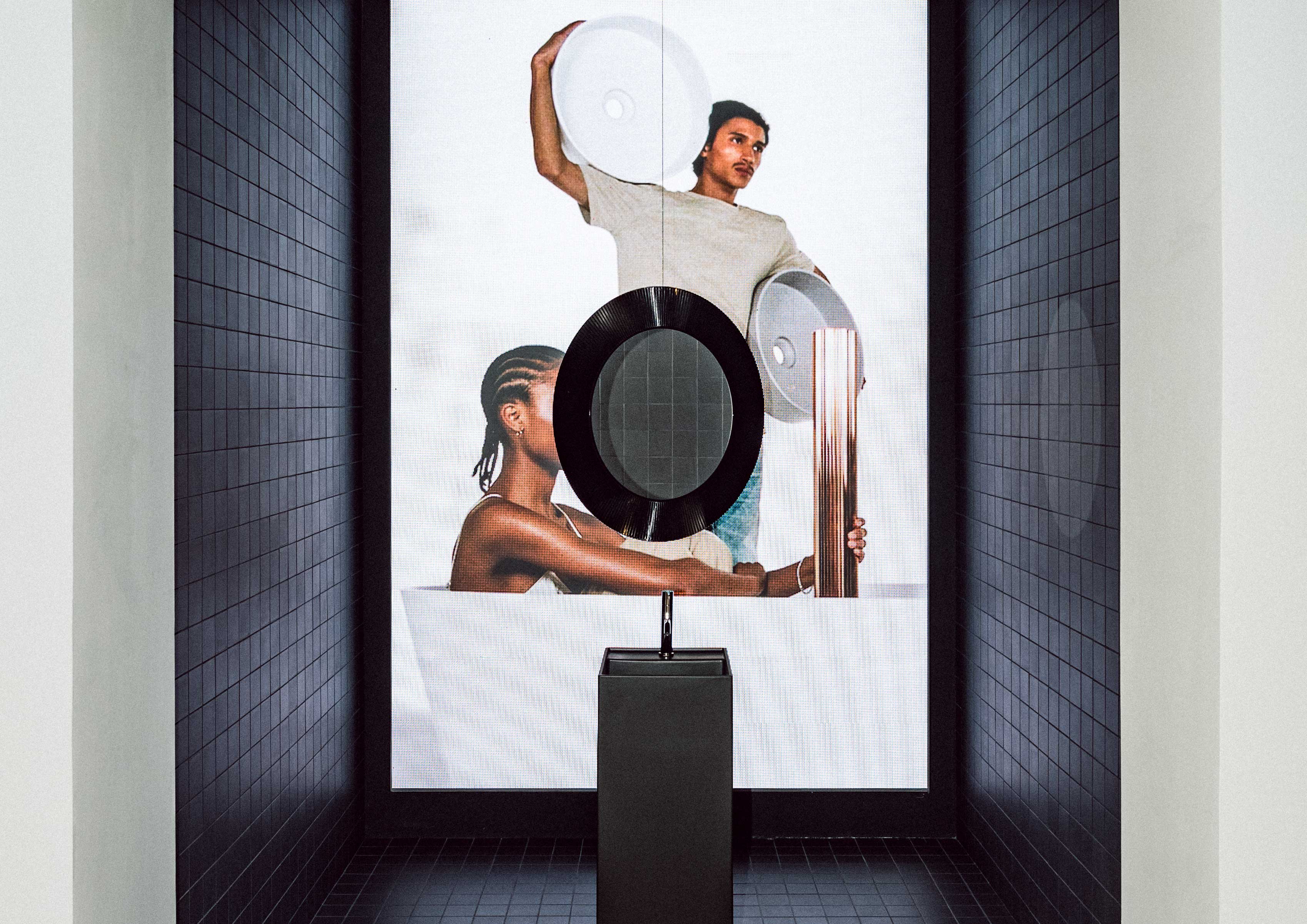 In Berlin folgte die Kartell • LAUFEN Pop-up-Präsentation und bot der deutschen Hauptstadt ein greifbares Erlebnis der Kollektion. Die Installation, die spielerisch gestaltet war, lud die Besucher ein, die Kollektion zu berühren und zusammenzustellen, neben dem umfangreichen Portfolio von LAUFEN. Die Installation zeigte eine Reihe von Skulpturen, die Badezimmerkeramiken von Kartell • LAUFEN einbezogen, sowie eine Auswahl an Badezimmermöbeln und Keramiken, kunstvoll an einer Wand aufgehängt – ihre verspielte Anordnung ein Hinweis auf die minimalistische Arbeit von Mondrian und ein Verweis auf die geometrische Natur und die sonnige Farbpalette der Kollektion. Auf dem großflächigen LED-Bildschirm zeigte der Kampagnenfilm eine stimmungsvolle Kulisse zur Installation.
